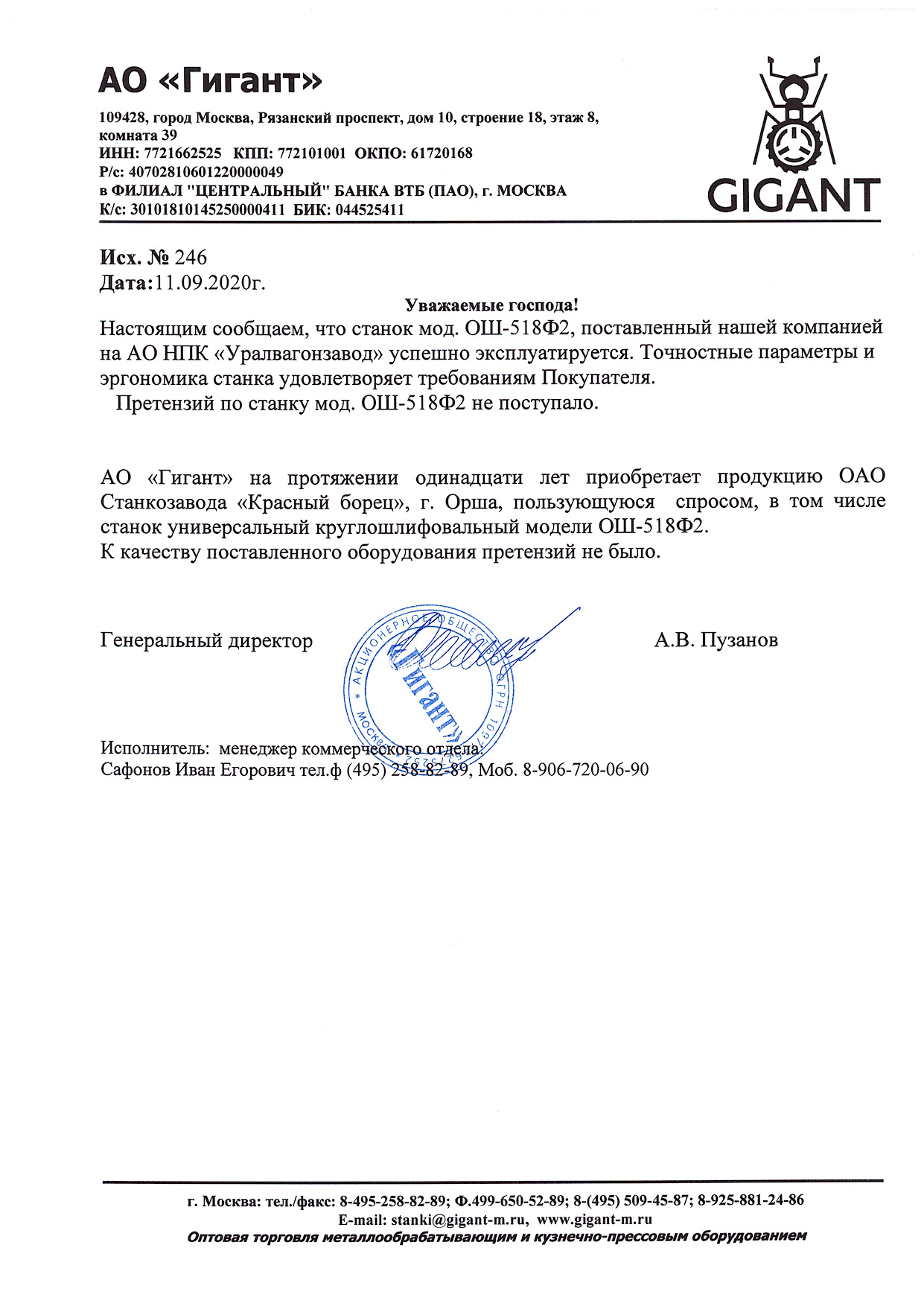АО «Гигант» на протяжении одинадцати лет приобретает продукцию ОАО Станкозавода «Красный борец», г. Орша, пользующуюся спросом, в том числе станок универсальный круглошлифовальный модели ОШ-518Ф2. К качеству поставленного оборудования претензий не было.